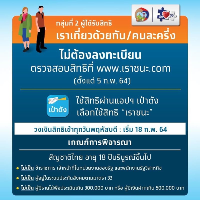 Zsf I Kjpi52im from www.chillpainai.com # ตรวจ สอบสิทธิ์ เรา ชนะ # คนละ ครึ่ง # เรา เที่ยว ด้วยกัน # เรา ชนะ ผู้ใช้สิทธิคนละครึ่งเฟส 1 จะได้รับสิทธิเพิ่ม 500 บาท และขยายเวลาใช้สิทธิได้ถึง 31 มี.ค. เคลียร์ชัด มาตรการเยียวยาโควิดรอบ 2ทั้ง เราชนะ และ คนละครึ่ง รอบเก็บตก โดย รมว.คลัง ตอบทุกข้อสงสัย ใครได้บ้าง ใช้เกณฑ์อะไร บัตรคนจนเข้าร่วม. 64 กลุ่มคนละครึ่งและเที่ยวด้วยกัน 4 กุมภาพันธ์ 2564 5 กุมภาพันธ์ 2021 • 18:29 น. เราชนะ กลุ่มคนละครึ่ง เราชนะ ที่มีแอปเป๋าตัง สามารถตรวจสอบสถานะการได้รับสิทธิ เช็คสิทธิ์เราชนะว่าผ่านหรือไม่ ได้แล้วที่ เราชนะ.com Www เรา ชนะ com เช็ค สิทธิ์ ตรวจ สอบ สถานะ www.เราชนะ.com เช็คสิทธิ์ ตรวจสอบสิทธิเราชนะคนละครึ่งวันไหน วิํธีเช็ค. หลังจากที่โครงการเราชนะ เปิดให้ผู้ที่ใช้สิทธิ์ผ่านทางโครงการ คนละครึ่ง เราเที่ยวด้วยกัน สามารถเข้าร่วมโครงการเราชนะ โดยไม่ต้อง. ตรวจ สอบ เรา ชนะ / ลงทะเบียน เราชนะ ครึ่งวันแรกกว่า 5 ล้านคน ระบบลื่นปรื้ดไม่.